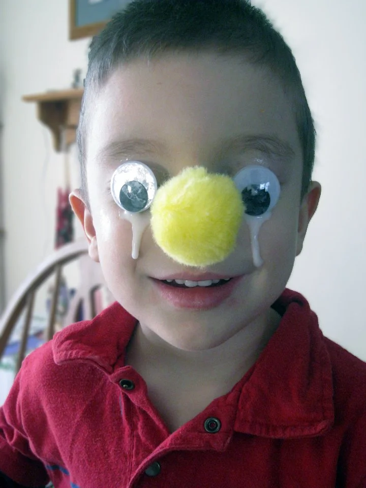 He had glued googly eyes directly onto his eyelids (or at least impressively close), and proudly stuck a bright yellow pom-pom right on his nose like some kind of tiny, chaotic clown masterpiece. Glue was… generously applied. Everywhere.